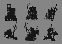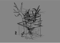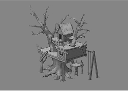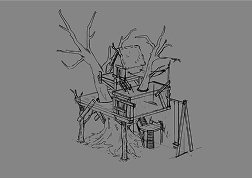 Exploration d’une cabane construite autour d’un arbre, pensée comme un espace de vie improvisé. La structure est composée de planches, d’échelles et d’éléments de récupération, assemblés de manière brute et fonctionnelle. Le dessin met en valeur la composition, la lisibilité des formes et les volumes, dans un traitement monochrome simple et lisible.